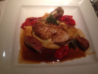 The breast of guinea fowl, sausage leg, friggitelli peppers and garlic mash, a recipe from the Campania region (£20.50) was a fine dish of complementary flavours and textures. The guinea fowl was tender and full of flavour, and was complemented by the coarser spicy sausage. The creamy garlic mash absorbed the jus and the peppers provided colour and piquancy.