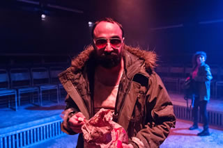 The Orange Tree stage has been transformed into a square drain; think of an abandoned lido paddling pool. Here we meet a bearded man with a leg brace wearing a filthy parka over vest and underpants. He’s chicken nugget-loving Zeppo, played on hyper-drive by Guy Rhys . With him is Egyptian-eyed Newcastle lass Ollie (captivating Nadia Clifford) who has come to Manchester to hunt for her missing sister. The third figure on stage is a silent woman in a dainty skirt and an octopus-head mask who must be fed chunky polyhedral dice.