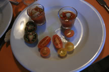 Next came a shot glass filled with a glorious chilled tomato, pepper & cucumber soup with a plate of tomatoes from their farm - the black tomatoes were delicious and could be and were purchased on our way out at the end of the evening from the deli at the front of the shop. Throughout the evening Gregg was giving tips - don't keep tomatoes in the fridge; in fact he recommends putting them in the sunshine before eating if possible to deepen the flavour - and apparently the vine gives no extra flavour but a divine smell when you open the pack!