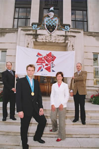 Olympic Gold medallist, Steve Trapmore, MBE who triumphed in Rowing at the Sydney 2000 Games, was on hand to receive the flag along with Cllr Rosemary Torrington, who has special responsibility for sport, Wandsworth Council's deputy director of leisure and amenity services, Paul McCue, and head of leisure and sports services, Simon Ingyon yesterday.