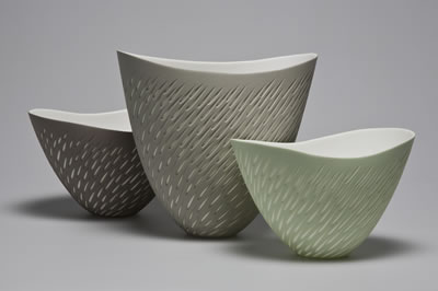 Both artists draw inspiration from a variety of sources; Wardell’s bone china pieces are inspired by architectural detail and sections of structure, while landscapes, gardens, stitched textiles, and the concept, order and visual nature of museums all influence the content and arrangement of Veevers’ works.
