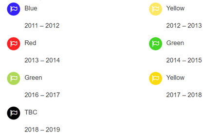 The coloured strip at the top of the tree stake identifies the year in which the tree was planted. Recent annual plantings are coloured coded as follows: