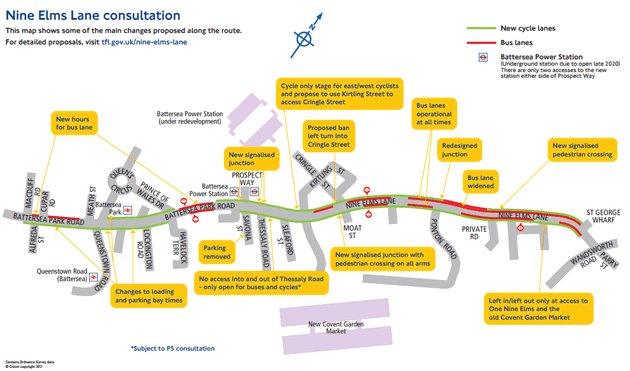 They say that their proposals will support more walking, cycling and greater use of public transport as well as reducing traffic on Nine Elms Lane and Battersea Park Road. The changes, which would be funded by money from developers, will include 2km of what TfL are describing as segregated cycle routes and a number of signalised pedestrian crossings. There would also be an extension of existing bus lanes and wider pavements. The would affect stretch of road from the Vauxhall Gyratory to Macduff Road and would connect to Cycle Superhighway 8 (CS8).