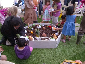 The fun on the Piazza included jazz group Brass Volcanoes; Vegetable Nannies, where children were kitted out with gloves and trowels and got stuck into the domestic duties of feeding, bathing, perambulating and other general T.L.C for baby vegetables; 3rdthought presented Invisible People – one-to one performances of a poem, story or joke told by an inter-generational troupe (left).